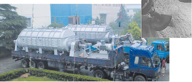 6、操作稳定:由于楔型浆叶特殊的压缩--膨胀搅拌作用,使物料颗粒充分与传热面接触,在轴向区间内,物料的温度、湿度、混合度梯度很小,从而保证了工艺的稳定性。